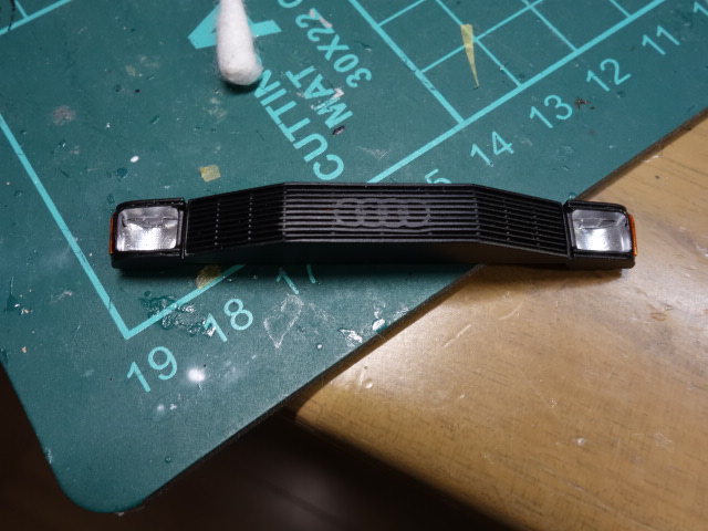 リアも同様、ボンネットのモールドを削り落として、場所確認用に穴を開けときました。