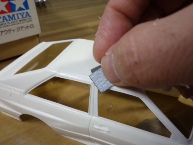 ルーフに0.5mmのプラ板を貼ってみました。合わせ目処理中。また、それに合わせて