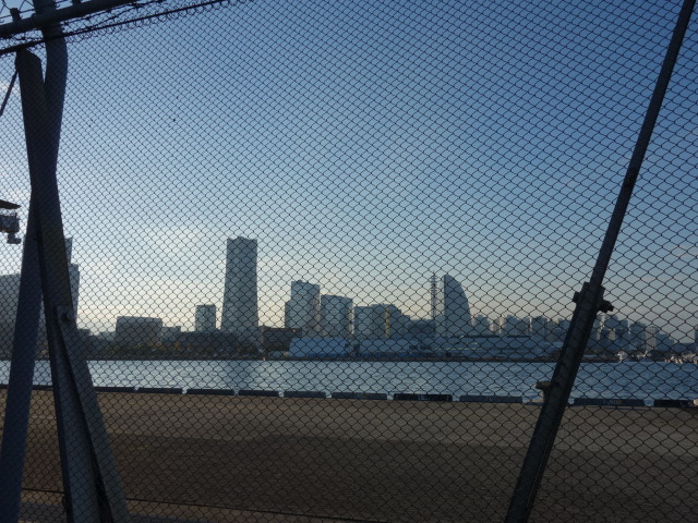 金網越しですが、夕暮れ時のみなとみらい方面。ホントにこの景色、好きです。
