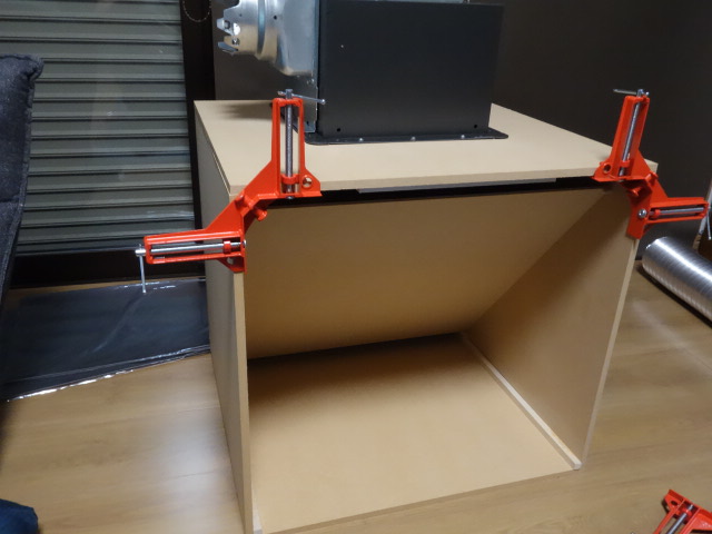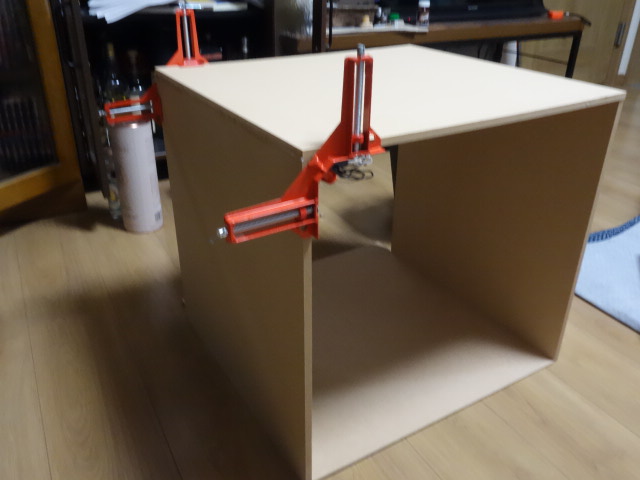 コーナークランプを使用し、木工用ボンドで固定していきます。てゆうか、何かデカいな・・。