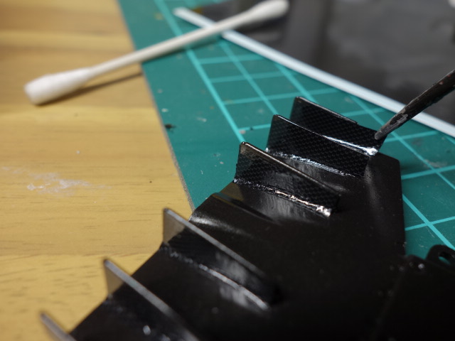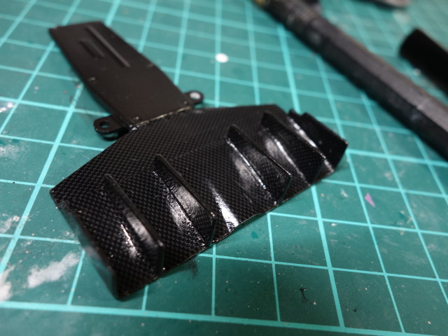 フロントのガードも。塗り分け後カーボンデカールを貼っております。いつもは