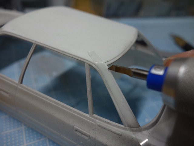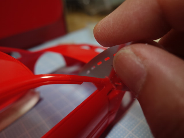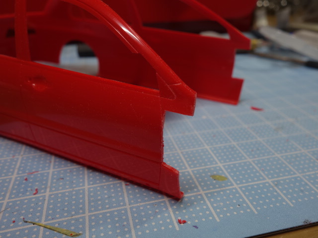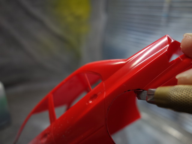 リアはホイールアーチを拡大すべく、マジックでなぞった部分をナイフの嶺で鉋の要領で
