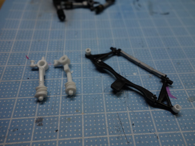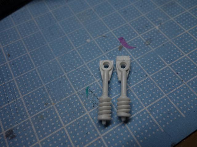 サスパーツがないので、車高を落とすべくキットのサスパーツを左から右のように改造