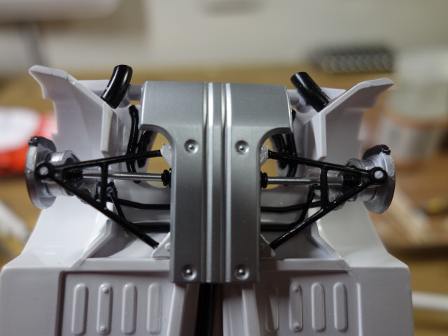 今回はエンジン本体をシャーシ側に接着してからパイピングしたので、干渉せずに組む事が